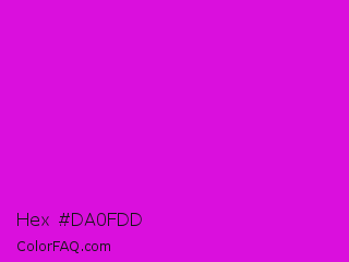 Hex #da0fdd Color is a normal magenta color and the nearest color is Deep Magenta #cc00cc. Hex code #da0fdd and RGB value is rgb(218,15,221). In RGB color space, this color is composed of 85% red, 6% green, 87% blue, In CMYK color space, this color is composed of 1% cyan, 93% magenta, 0% yellow , 13% black , In HSL color space, this color has a hue angle of 299° , 87% saturation and 46% lightness.