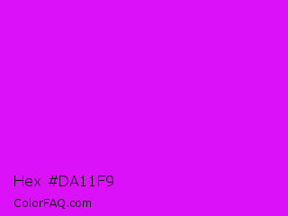 Hex #da11f9 Color is a normal magenta color and the nearest color is Phlox #df00ff. Hex code #da11f9 and RGB value is rgb(218,17,249). In RGB color space, this color is composed of 85% red, 7% green, 98% blue, In CMYK color space, this color is composed of 12% cyan, 93% magenta, 0% yellow , 2% black , In HSL color space, this color has a hue angle of 292° , 95% saturation and 52% lightness.