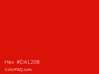 Hex #da1208 Color is a normal red color and the nearest color is Rosso Corsa #d40000. Hex code #da1208 and RGB value is rgb(218,18,8). In RGB color space, this color is composed of 85% red, 7% green, 3% blue, In CMYK color space, this color is composed of 0% cyan, 92% magenta, 96% yellow , 15% black , In HSL color space, this color has a hue angle of 3° , 93% saturation and 44% lightness.