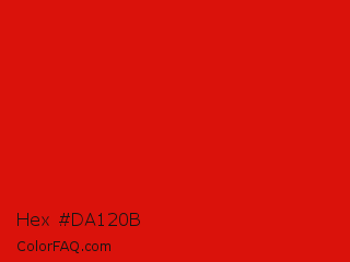 Hex #da120b Color is a normal red color and the nearest color is Rosso Corsa #d40000. Hex code #da120b and RGB value is rgb(218,18,11). In RGB color space, this color is composed of 85% red, 7% green, 4% blue, In CMYK color space, this color is composed of 0% cyan, 92% magenta, 95% yellow , 15% black , In HSL color space, this color has a hue angle of 2° , 90% saturation and 45% lightness.