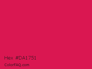 Hex #da1751 Color is a normal rose color and the nearest color is Spanish Crimson #e51a4c. Hex code #da1751 and RGB value is rgb(218,23,81). In RGB color space, this color is composed of 85% red, 9% green, 32% blue, In CMYK color space, this color is composed of 0% cyan, 89% magenta, 63% yellow , 15% black , In HSL color space, this color has a hue angle of 342° , 81% saturation and 47% lightness.