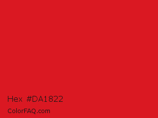 Hex #da1822 Color is a normal red color and the nearest color is Maximum Red #d92121. Hex code #da1822 and RGB value is rgb(218,24,34). In RGB color space, this color is composed of 85% red, 9% green, 13% blue, In CMYK color space, this color is composed of 0% cyan, 89% magenta, 84% yellow , 15% black , In HSL color space, this color has a hue angle of 357° , 80% saturation and 47% lightness.