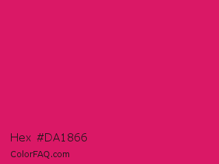 Hex #da1866 Color is a normal rose color and the nearest color is Dogwood Rose #d71868. Hex code #da1866 and RGB value is rgb(218,24,102). In RGB color space, this color is composed of 85% red, 9% green, 40% blue, In CMYK color space, this color is composed of 0% cyan, 89% magenta, 53% yellow , 15% black , In HSL color space, this color has a hue angle of 336° , 80% saturation and 47% lightness.