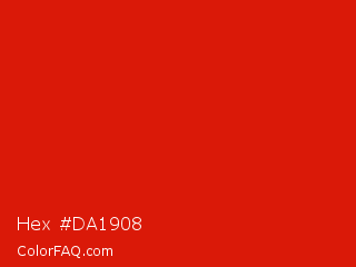 Hex #da1908 Color is a normal red color and the nearest color is Maximum Red #d92121. Hex code #da1908 and RGB value is rgb(218,25,8). In RGB color space, this color is composed of 85% red, 10% green, 3% blue, In CMYK color space, this color is composed of 0% cyan, 89% magenta, 96% yellow , 15% black , In HSL color space, this color has a hue angle of 5° , 93% saturation and 44% lightness.