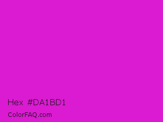 Hex #da1bd1 Color is a normal magenta color and the nearest color is Steel Pink #cc33cc. Hex code #da1bd1 and RGB value is rgb(218,27,209). In RGB color space, this color is composed of 85% red, 11% green, 82% blue, In CMYK color space, this color is composed of 0% cyan, 88% magenta, 4% yellow , 15% black , In HSL color space, this color has a hue angle of 303° , 78% saturation and 48% lightness.
