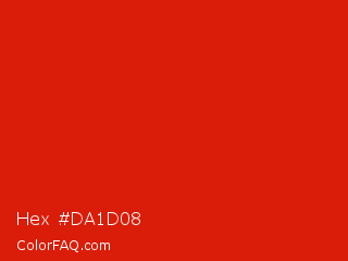 Hex #da1d08 Color is a normal red color and the nearest color is Maximum Red #d92121. Hex code #da1d08 and RGB value is rgb(218,29,8). In RGB color space, this color is composed of 85% red, 11% green, 3% blue, In CMYK color space, this color is composed of 0% cyan, 87% magenta, 96% yellow , 15% black , In HSL color space, this color has a hue angle of 6° , 93% saturation and 44% lightness.