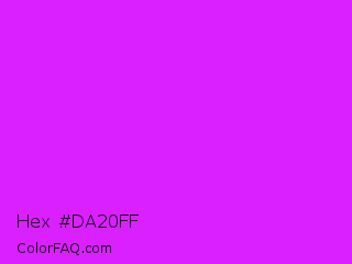 Hex #da20ff Color is a normal purple color and the nearest color is Phlox #df00ff. Hex code #da20ff and RGB value is rgb(218,32,255). In RGB color space, this color is composed of 85% red, 13% green, 100% blue, In CMYK color space, this color is composed of 15% cyan, 87% magenta, 0% yellow , 0% black , In HSL color space, this color has a hue angle of 290° , 100% saturation and 56% lightness.