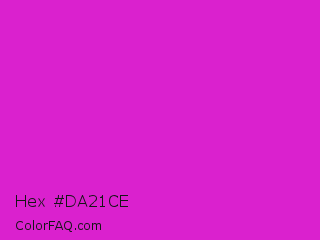 Hex #da21ce Color is a normal magenta color and the nearest color is Steel Pink #cc33cc. Hex code #da21ce and RGB value is rgb(218,33,206). In RGB color space, this color is composed of 85% red, 13% green, 81% blue, In CMYK color space, this color is composed of 0% cyan, 85% magenta, 6% yellow , 15% black , In HSL color space, this color has a hue angle of 304° , 74% saturation and 49% lightness.