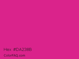 Hex #da238b Color is a normal magenta color and the nearest color is Barbie Pink #e0218a. Hex code #da238b and RGB value is rgb(218,35,139). In RGB color space, this color is composed of 85% red, 14% green, 55% blue, In CMYK color space, this color is composed of 0% cyan, 84% magenta, 36% yellow , 15% black , In HSL color space, this color has a hue angle of 326° , 72% saturation and 50% lightness.