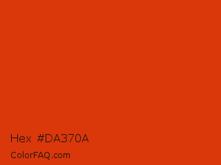 Hex #da370a Color is a normal red color and the nearest color is Sinopia #cb410b. Hex code #da370a and RGB value is rgb(218,55,10). In RGB color space, this color is composed of 85% red, 22% green, 4% blue, In CMYK color space, this color is composed of 0% cyan, 75% magenta, 95% yellow , 15% black , In HSL color space, this color has a hue angle of 13° , 91% saturation and 45% lightness.