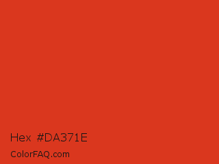 Hex #da371e Color is a normal red color and the nearest color is Vermilion #d9381e. Hex code #da371e and RGB value is rgb(218,55,30). In RGB color space, this color is composed of 85% red, 22% green, 12% blue, In CMYK color space, this color is composed of 0% cyan, 75% magenta, 86% yellow , 15% black , In HSL color space, this color has a hue angle of 8° , 76% saturation and 49% lightness.