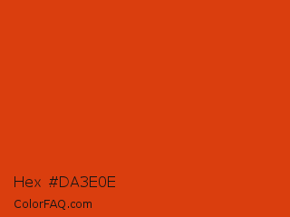 Hex #da3e0e Color is a normal red color and the nearest color is Sinopia #cb410b. Hex code #da3e0e and RGB value is rgb(218,62,14). In RGB color space, this color is composed of 85% red, 24% green, 5% blue, In CMYK color space, this color is composed of 0% cyan, 72% magenta, 94% yellow , 15% black , In HSL color space, this color has a hue angle of 14° , 88% saturation and 45% lightness.