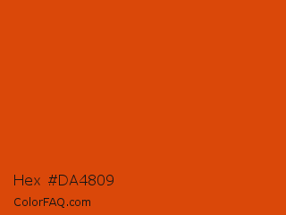 Hex #da4809 Color is a normal orange color and the nearest color is Grenadier #d54600. Hex code #da4809 and RGB value is rgb(218,72,9). In RGB color space, this color is composed of 85% red, 28% green, 4% blue, In CMYK color space, this color is composed of 0% cyan, 67% magenta, 96% yellow , 15% black , In HSL color space, this color has a hue angle of 18° , 92% saturation and 45% lightness.