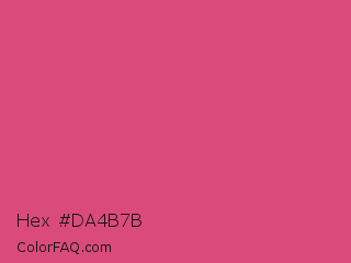 Hex #da4b7b Color is a normal rose color and the nearest color is Cranberry #db5079. Hex code #da4b7b and RGB value is rgb(218,75,123). In RGB color space, this color is composed of 85% red, 29% green, 48% blue, In CMYK color space, this color is composed of 0% cyan, 66% magenta, 44% yellow , 15% black , In HSL color space, this color has a hue angle of 340° , 66% saturation and 57% lightness.