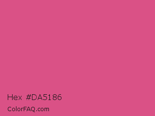 Hex #da5186 Color is a normal rose color and the nearest color is Fandango Pink #de5285. Hex code #da5186 and RGB value is rgb(218,81,134). In RGB color space, this color is composed of 85% red, 32% green, 53% blue, In CMYK color space, this color is composed of 0% cyan, 63% magenta, 39% yellow , 15% black , In HSL color space, this color has a hue angle of 337° , 65% saturation and 59% lightness.