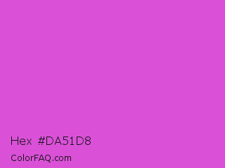 Hex #da51d8 Color is a normal magenta color and the nearest color is Orchid #da70d6. Hex code #da51d8 and RGB value is rgb(218,81,216). In RGB color space, this color is composed of 85% red, 32% green, 85% blue, In CMYK color space, this color is composed of 0% cyan, 63% magenta, 1% yellow , 15% black , In HSL color space, this color has a hue angle of 301° , 65% saturation and 59% lightness.