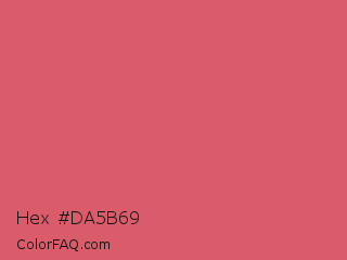 Hex #da5b69 Color is a light red color and the nearest color is Mandy #e25465. Hex code #da5b69 and RGB value is rgb(218,91,105). In RGB color space, this color is composed of 85% red, 36% green, 41% blue, In CMYK color space, this color is composed of 0% cyan, 58% magenta, 52% yellow , 15% black , In HSL color space, this color has a hue angle of 353° , 63% saturation and 61% lightness.
