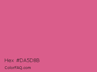 Hex #da5d8b Color is a light rose color and the nearest color is Blush #de5d83. Hex code #da5d8b and RGB value is rgb(218,93,139). In RGB color space, this color is composed of 85% red, 36% green, 55% blue, In CMYK color space, this color is composed of 0% cyan, 57% magenta, 36% yellow , 15% black , In HSL color space, this color has a hue angle of 338° , 63% saturation and 61% lightness.