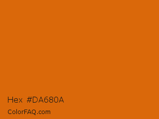 Hex #da680a Color is a normal orange color and the nearest color is Bamboo #da6304. Hex code #da680a and RGB value is rgb(218,104,10). In RGB color space, this color is composed of 85% red, 41% green, 4% blue, In CMYK color space, this color is composed of 0% cyan, 52% magenta, 95% yellow , 15% black , In HSL color space, this color has a hue angle of 27° , 91% saturation and 45% lightness.