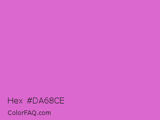 Hex #da68ce Color is a light magenta color and the nearest color is Orchid #da70d6. Hex code #da68ce and RGB value is rgb(218,104,206). In RGB color space, this color is composed of 85% red, 41% green, 81% blue, In CMYK color space, this color is composed of 0% cyan, 52% magenta, 6% yellow , 15% black , In HSL color space, this color has a hue angle of 306° , 61% saturation and 63% lightness.