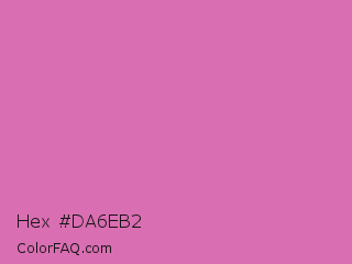 Hex #da6eb2 Color is a light magenta color and the nearest color is Sky Magenta #cf71af. Hex code #da6eb2 and RGB value is rgb(218,110,178). In RGB color space, this color is composed of 85% red, 43% green, 70% blue, In CMYK color space, this color is composed of 0% cyan, 50% magenta, 18% yellow , 15% black , In HSL color space, this color has a hue angle of 322° , 59% saturation and 64% lightness.