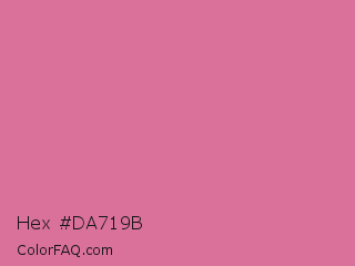 Hex #da719b Color is a light rose color and the nearest color is Thulian Pink #de6fa1. Hex code #da719b and RGB value is rgb(218,113,155). In RGB color space, this color is composed of 85% red, 44% green, 61% blue, In CMYK color space, this color is composed of 0% cyan, 48% magenta, 29% yellow , 15% black , In HSL color space, this color has a hue angle of 336° , 59% saturation and 65% lightness.