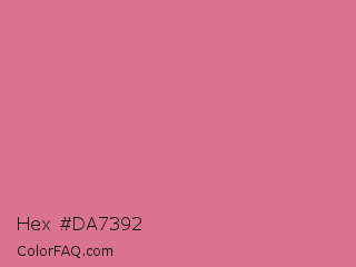 Hex #da7392 Color is a light rose color and the nearest color is Pale Red Violet #db7093. Hex code #da7392 and RGB value is rgb(218,115,146). In RGB color space, this color is composed of 85% red, 45% green, 57% blue, In CMYK color space, this color is composed of 0% cyan, 47% magenta, 33% yellow , 15% black , In HSL color space, this color has a hue angle of 342° , 58% saturation and 65% lightness.