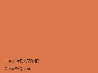Hex #da784b Color is a normal orange color and the nearest color is Raw Sienna Crayola #d27d46. Hex code #da784b and RGB value is rgb(218,120,75). In RGB color space, this color is composed of 85% red, 47% green, 29% blue, In CMYK color space, this color is composed of 0% cyan, 45% magenta, 66% yellow , 15% black , In HSL color space, this color has a hue angle of 19° , 66% saturation and 57% lightness.