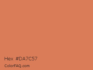 Hex #da7c57 Color is a normal orange color and the nearest color is Japonica #d87c63. Hex code #da7c57 and RGB value is rgb(218,124,87). In RGB color space, this color is composed of 85% red, 49% green, 34% blue, In CMYK color space, this color is composed of 0% cyan, 43% magenta, 60% yellow , 15% black , In HSL color space, this color has a hue angle of 17° , 64% saturation and 60% lightness.