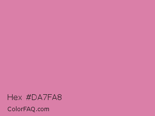 Hex #da7fa8 Color is a light rose color and the nearest color is Middle Purple #d982b5. Hex code #da7fa8 and RGB value is rgb(218,127,168). In RGB color space, this color is composed of 85% red, 50% green, 66% blue, In CMYK color space, this color is composed of 0% cyan, 42% magenta, 23% yellow , 15% black , In HSL color space, this color has a hue angle of 333° , 55% saturation and 68% lightness.