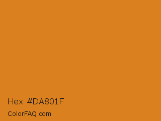 Hex #da801f Color is a normal orange color and the nearest color is Zest #e5841b. Hex code #da801f and RGB value is rgb(218,128,31). In RGB color space, this color is composed of 85% red, 50% green, 12% blue, In CMYK color space, this color is composed of 0% cyan, 41% magenta, 86% yellow , 15% black , In HSL color space, this color has a hue angle of 31° , 75% saturation and 49% lightness.