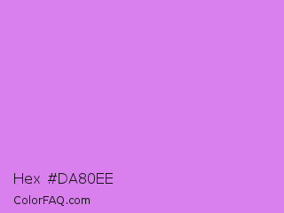 Hex #da80ee Color is a light purple color and the nearest color is Bright Lilac #d891ef. Hex code #da80ee and RGB value is rgb(218,128,238). In RGB color space, this color is composed of 85% red, 50% green, 93% blue, In CMYK color space, this color is composed of 8% cyan, 46% magenta, 0% yellow , 7% black , In HSL color space, this color has a hue angle of 289° , 76% saturation and 72% lightness.