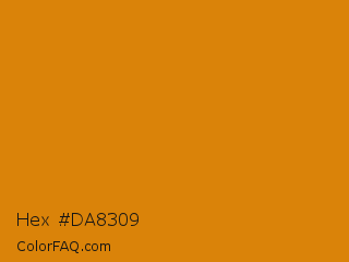 Hex #da8309 Color is a normal orange color and the nearest color is Fulvous #e48400. Hex code #da8309 and RGB value is rgb(218,131,9). In RGB color space, this color is composed of 85% red, 51% green, 4% blue, In CMYK color space, this color is composed of 0% cyan, 40% magenta, 96% yellow , 15% black , In HSL color space, this color has a hue angle of 35° , 92% saturation and 45% lightness.