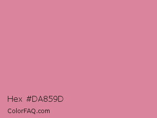 Hex #da859d Color is a light rose color and the nearest color is Shimmering Blush #d98695. Hex code #da859d and RGB value is rgb(218,133,157). In RGB color space, this color is composed of 85% red, 52% green, 62% blue, In CMYK color space, this color is composed of 0% cyan, 39% magenta, 28% yellow , 15% black , In HSL color space, this color has a hue angle of 343° , 53% saturation and 69% lightness.