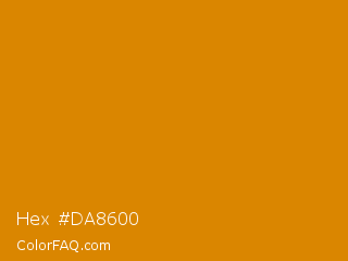 Hex #da8600 Color is a normal orange color and the nearest color is Fulvous #e48400. Hex code #da8600 and RGB value is rgb(218,134,0). In RGB color space, this color is composed of 85% red, 53% green, 0% blue, In CMYK color space, this color is composed of 0% cyan, 39% magenta, 100% yellow , 15% black , In HSL color space, this color has a hue angle of 37° , 100% saturation and 43% lightness.