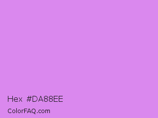 Hex #da88ee Color is a light purple color and the nearest color is Bright Lilac #d891ef. Hex code #da88ee and RGB value is rgb(218,136,238). In RGB color space, this color is composed of 85% red, 53% green, 93% blue, In CMYK color space, this color is composed of 8% cyan, 43% magenta, 0% yellow , 7% black , In HSL color space, this color has a hue angle of 288° , 75% saturation and 73% lightness.