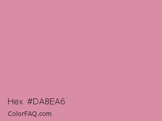 Hex #da8ea6 Color is a light rose color and the nearest color is Can Can #d591a4. Hex code #da8ea6 and RGB value is rgb(218,142,166). In RGB color space, this color is composed of 85% red, 56% green, 65% blue, In CMYK color space, this color is composed of 0% cyan, 35% magenta, 24% yellow , 15% black , In HSL color space, this color has a hue angle of 341° , 51% saturation and 71% lightness.