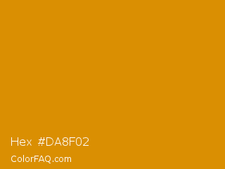Hex #da8f02 Color is a normal orange color and the nearest color is Harvest Gold #da9100. Hex code #da8f02 and RGB value is rgb(218,143,2). In RGB color space, this color is composed of 85% red, 56% green, 1% blue, In CMYK color space, this color is composed of 0% cyan, 34% magenta, 99% yellow , 15% black , In HSL color space, this color has a hue angle of 39° , 98% saturation and 43% lightness.