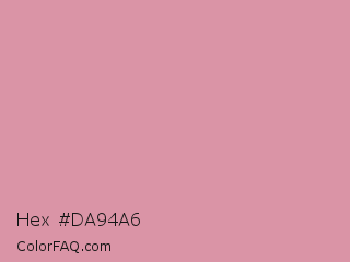 Hex #da94a6 Color is a light red color and the nearest color is Can Can #d591a4. Hex code #da94a6 and RGB value is rgb(218,148,166). In RGB color space, this color is composed of 85% red, 58% green, 65% blue, In CMYK color space, this color is composed of 0% cyan, 32% magenta, 24% yellow , 15% black , In HSL color space, this color has a hue angle of 345° , 49% saturation and 72% lightness.