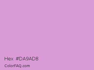 Hex #da9ad8 Color is a light magenta color and the nearest color is Medium Lavender Magenta #dda0dd. Hex code #da9ad8 and RGB value is rgb(218,154,216). In RGB color space, this color is composed of 85% red, 60% green, 85% blue, In CMYK color space, this color is composed of 0% cyan, 29% magenta, 1% yellow , 15% black , In HSL color space, this color has a hue angle of 302° , 46% saturation and 73% lightness.