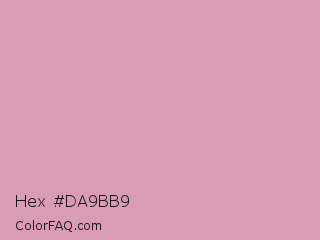 Hex #da9bb9 Color is a light rose color and the nearest color is Shocking #e292c0. Hex code #da9bb9 and RGB value is rgb(218,155,185). In RGB color space, this color is composed of 85% red, 61% green, 73% blue, In CMYK color space, this color is composed of 0% cyan, 29% magenta, 15% yellow , 15% black , In HSL color space, this color has a hue angle of 331° , 46% saturation and 73% lightness.