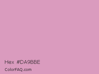 Hex #da9bbe Color is a light magenta color and the nearest color is Shocking #e292c0. Hex code #da9bbe and RGB value is rgb(218,155,190). In RGB color space, this color is composed of 85% red, 61% green, 75% blue, In CMYK color space, this color is composed of 0% cyan, 29% magenta, 13% yellow , 15% black , In HSL color space, this color has a hue angle of 327° , 46% saturation and 73% lightness.