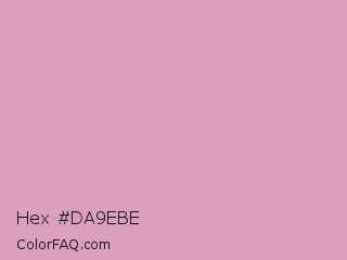 Hex #da9ebe Color is a light rose color and the nearest color is Kobi #e79fc4. Hex code #da9ebe and RGB value is rgb(218,158,190). In RGB color space, this color is composed of 85% red, 62% green, 75% blue, In CMYK color space, this color is composed of 0% cyan, 28% magenta, 13% yellow , 15% black , In HSL color space, this color has a hue angle of 328° , 45% saturation and 74% lightness.