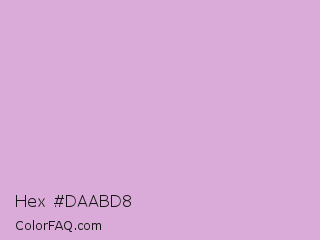 Hex #daabd8 Color is a light magenta color and the nearest color is Pink Lavender #d8b2d1. Hex code #daabd8 and RGB value is rgb(218,171,216). In RGB color space, this color is composed of 85% red, 67% green, 85% blue, In CMYK color space, this color is composed of 0% cyan, 22% magenta, 1% yellow , 15% black , In HSL color space, this color has a hue angle of 303° , 39% saturation and 76% lightness.