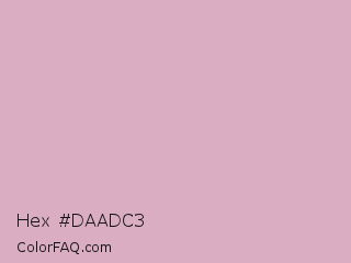 Hex #daadc3 Color is a light rose color and the nearest color is Blossom #dcb4bc. Hex code #daadc3 and RGB value is rgb(218,173,195). In RGB color space, this color is composed of 85% red, 68% green, 76% blue, In CMYK color space, this color is composed of 0% cyan, 21% magenta, 11% yellow , 15% black , In HSL color space, this color has a hue angle of 331° , 38% saturation and 77% lightness.