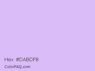 Hex #dabdf8 Color is a very light violet color and the nearest color is Perfume #d0bef8. Hex code #dabdf8 and RGB value is rgb(218,189,248). In RGB color space, this color is composed of 85% red, 74% green, 97% blue, In CMYK color space, this color is composed of 12% cyan, 24% magenta, 0% yellow , 3% black , In HSL color space, this color has a hue angle of 269° , 81% saturation and 86% lightness.