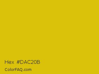 Hex #dac20b Color is a normal yellow color and the nearest color is Gold Tips #deba13. Hex code #dac20b and RGB value is rgb(218,194,11). In RGB color space, this color is composed of 85% red, 76% green, 4% blue, In CMYK color space, this color is composed of 0% cyan, 11% magenta, 95% yellow , 15% black , In HSL color space, this color has a hue angle of 53° , 90% saturation and 45% lightness.
