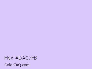 Hex #dac7fb Color is a very light violet color and the nearest color is Moon Raker #d6cef6. Hex code #dac7fb and RGB value is rgb(218,199,251). In RGB color space, this color is composed of 85% red, 78% green, 98% blue, In CMYK color space, this color is composed of 13% cyan, 21% magenta, 0% yellow , 2% black , In HSL color space, this color has a hue angle of 262° , 87% saturation and 88% lightness.