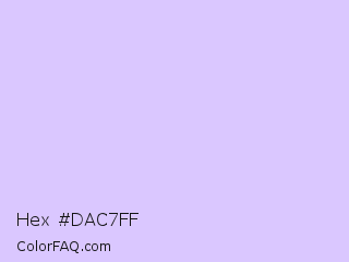 Hex #dac7ff Color is a very light indigo color and the nearest color is Pale Lavender #dcd0ff. Hex code #dac7ff and RGB value is rgb(218,199,255). In RGB color space, this color is composed of 85% red, 78% green, 100% blue, In CMYK color space, this color is composed of 15% cyan, 22% magenta, 0% yellow , 0% black , In HSL color space, this color has a hue angle of 260° , 100% saturation and 89% lightness.