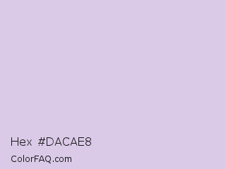 Hex #dacae8 Color is a very light purple color and the nearest color is Languid Lavender #d6cadd. Hex code #dacae8 and RGB value is rgb(218,202,232). In RGB color space, this color is composed of 85% red, 79% green, 91% blue, In CMYK color space, this color is composed of 6% cyan, 13% magenta, 0% yellow , 9% black , In HSL color space, this color has a hue angle of 272° , 39% saturation and 85% lightness.